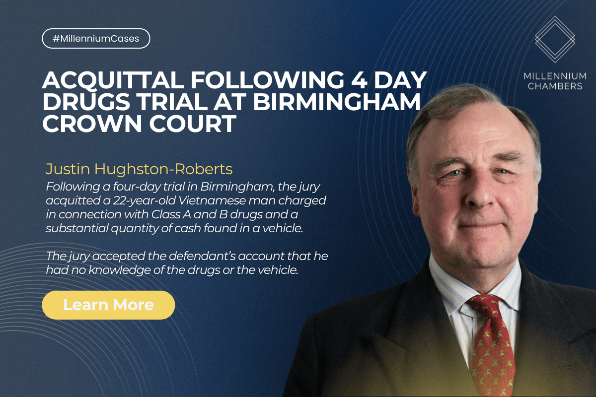 Justin Hugheston-Roberts successfully secured the acquittal of a 22-year-old Vietnamese man following a four-day jury trial at Birmingham Crown Court, involving allegations of possession with intent to supply Class A and Class B controlled drugs.